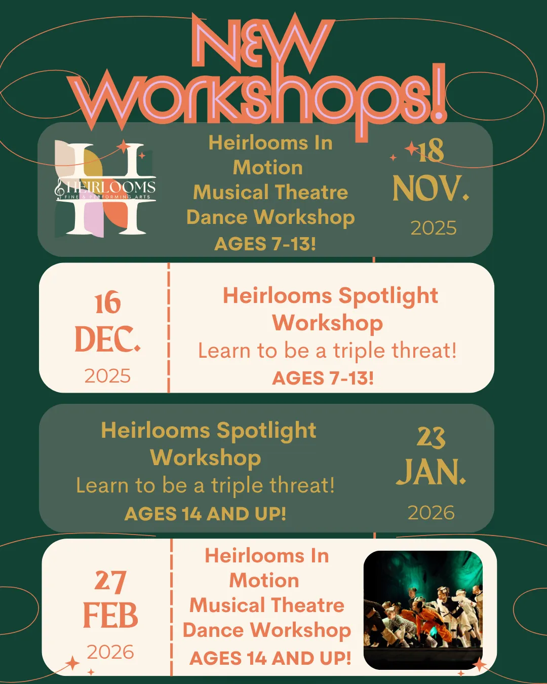 Heirlooms in Motion - Learn to move like a musical theatre pro! This high-energy dance workshop focuses on storytelling through movement and stage choreography. Perfect for all levels — come ready to learn, laugh, and dance your heart out!